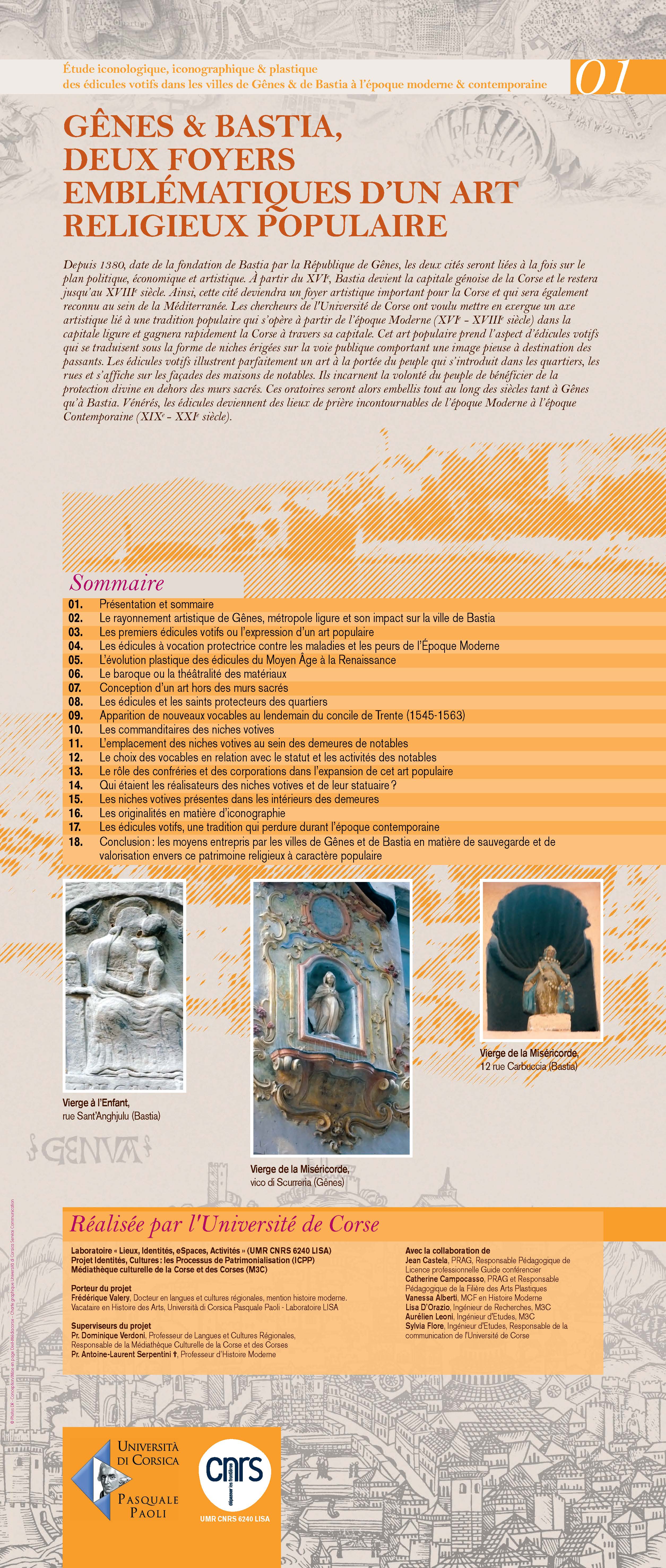 Depuis 1380, date de la fondation de Bastia par la République de Gênes, les deux cités seront liées à la fois sur le plan politique, économique et artistique. À partir du XVIe, Bastia devient la capitale génoise de la Corse et le restera jusqu'au XVIIIe siècle. Ainsi, cette cité deviendra un foyer artistique important pour la Corse et qui sera également reconnu au sein de la Méditerranée. Les chercheurs de l'Université de Corse ont voulu mettre en exergue un axe artistique lié à une tradition populaire qui s'opère à partir de l'époque Moderne (XVIe - XVIIIe siècle) dans la capitale ligure et gagnera rapidement la Corse à travers sa capitale. Cet art populaire prend l'aspect d'édicules votifs qui se traduisent sous la forme de niches érigées sur la voie publique comportant une image pieuse à destination des passants. Les édicules votifs illustrent parfaitement un art à la portée du peuple qui s'introduit dans les quartiers, les rues et s'affiche sur les façades des maisons de notables. Ils incarnent la volonté du peuple de bénéficier de la protection divine en dehors des murs sacrés. Ces oratoires seront alors embellis tout au long des siècles tant à Gênes qu'à Bastia. Vénérés, les édicules deviennent des lieux de prière incontournables de l'époque Moderne à l'époque Contemporaine (XIXe - XXIe siècle).